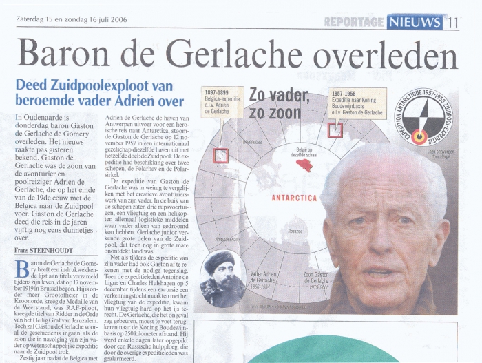 Beschrijving Uit de krant: Baron de Gerlache overleden - deed Zuidpoolexploot van beroemde vader Adrien over